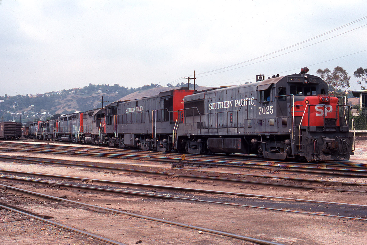 The other extreme of what a cab hop could look like is illustrated above with SP U28B 7025 along with 6 other road units departing SP’s Taylor Yard in Los Angeles in May of 1977. What make this cab hop extreme isn’t so much the number of units as much as the locomotive models pulling the caboose: U28B / U50 / GP35 / DD35 / U25B / U25B / DD35. Only one other railroad could assemble this collection of power – the UP, but I doubt they ever assembled a lash-up like this.