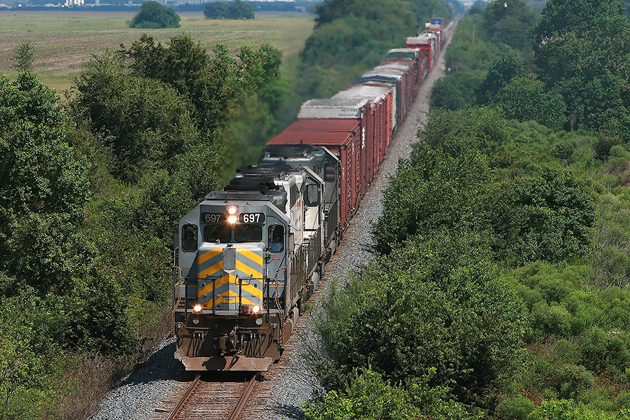 KCS 697 and 2 other SD40-2’s have an IJALZJ (Intermodal Jackson, MS to Lazaro Cardenas, Mexico) at track speed just west of Rosenberg, TX on 9/14/2007. It sure looks like a manifest train, but bringing up the rear were a couple of well cars with some 48′ and 53′ containers.