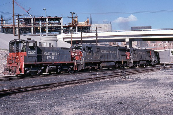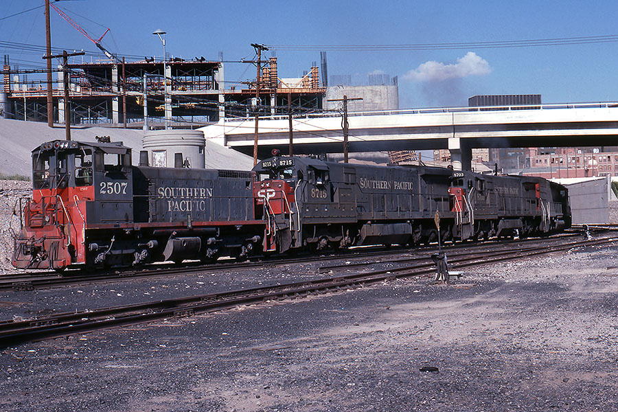 I’m at the west end of the trainway in El Paso, TX on a typically hot Sept. 9, 1978. A Dallas Street yard job with SP SW1500 2507 has coupled up to the power of a WB freight to pull a bad order car from the train.