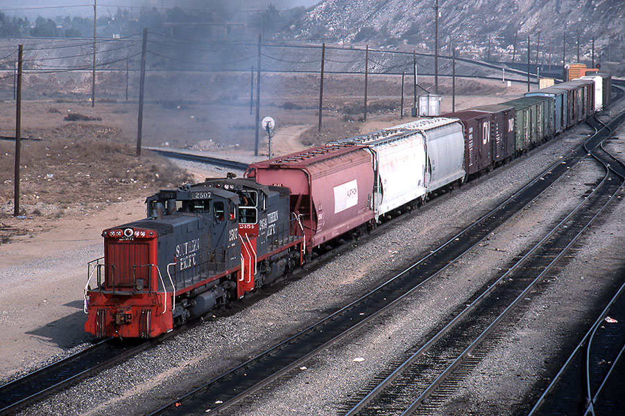 My next encounter with the 2507 was 9 years later. It and fellow SW1500 2454 are returning to West Colton Yard after a day work on the Riverside local.