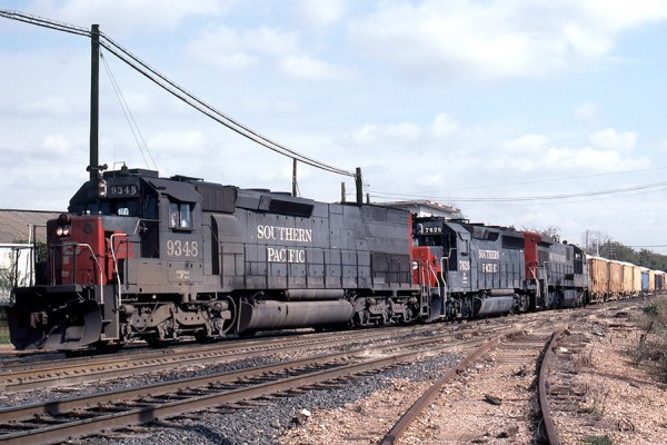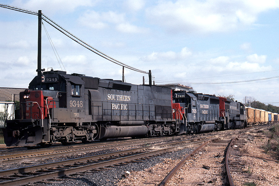 It’s a chilly Nov. 23, 1985 as SP 9348/7626/8771 make the turn onto SP’s Lufkin sub at Tower 26 interlocking in Houston, TX. You can see the top of the Tower 26 structure above the cab of the second locomotive.