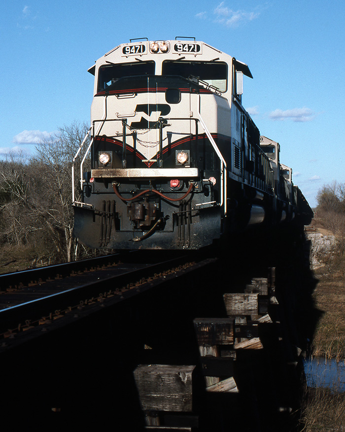 BN 9471 and 2 other SD70MAC’s cross a bayou less than a mile from the entrance to the W.A. Parrish generating plant on Dec. 27, 1997. This plant typically receives 2-3 trainsets a day of PRB coal.