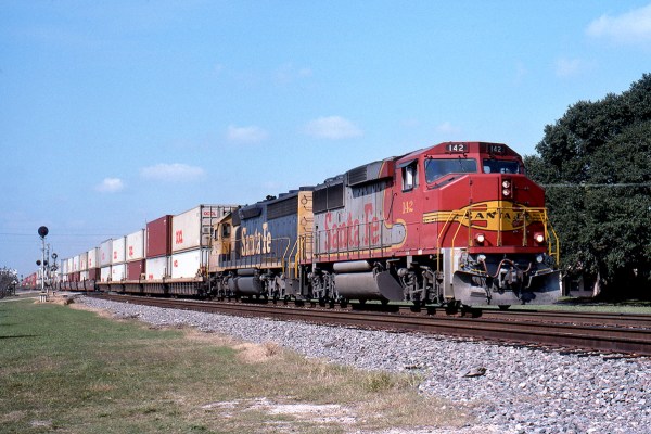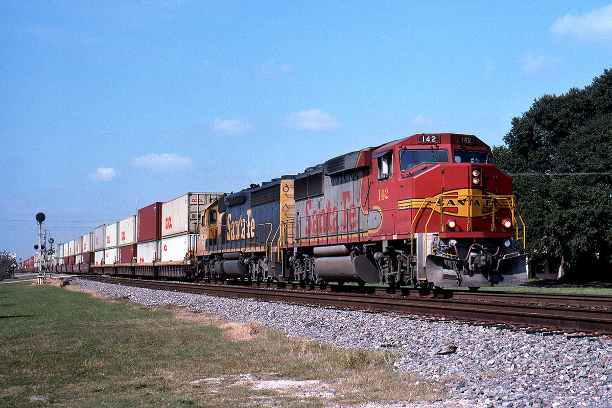 A redhead and a blond have this Houston-bound intermodal well in hand as they pass through the sleepy little town of Wallis, Texas on Nov. 8, 1997.