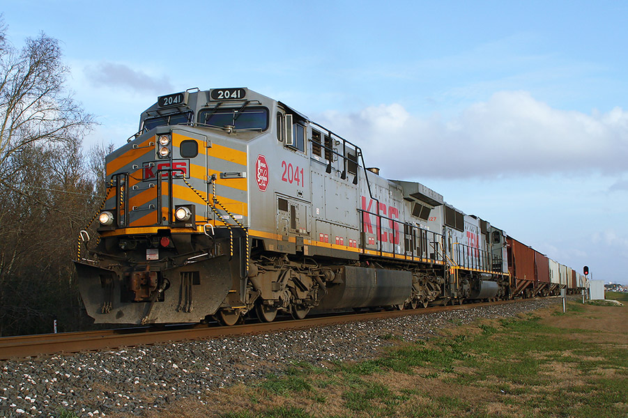 The sun has just dropped below the horizon on Jan. 3, 2005 as KCS AC4400CW 2041 and a TFM SD70MAC lead a Port Arthur-Laredo manifest past the intermediate at MP20.5 on UP’s Glidden sub. This train will travel west on the Glidden sub until it reaches Flatonia where it will switch over to the UP’s Cuero sub for the rest of this crews trip to Victoria.