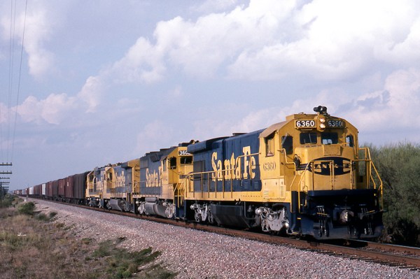 This quartet of “little” units has its grain train at track speed just south of Sealy, TX as it tries to stay ahead of the looming storm. Just over 90 miles remain until this trains final destination of Port of Galveston.