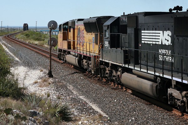 UP’s Sunset Route has close calls with the U.S.-Mexico border at 6 points during its trek across the Southwest U.S. The above westbound nears the first of these points, the bridge crossing Lake Amistad Reservoir just west of Del Rio, Texas on May 11, 2006. The border at this point is 2 miles south of the UP right-of-way.