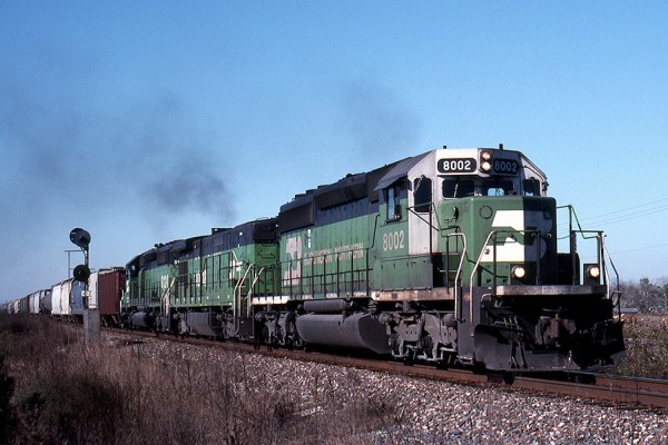 At first glance, BN 8002 looks like just one more BN SD40-2, but don’t be fooled. Note the engine number on the cab, and the BN logo on the long hood, opposite of standard practice.