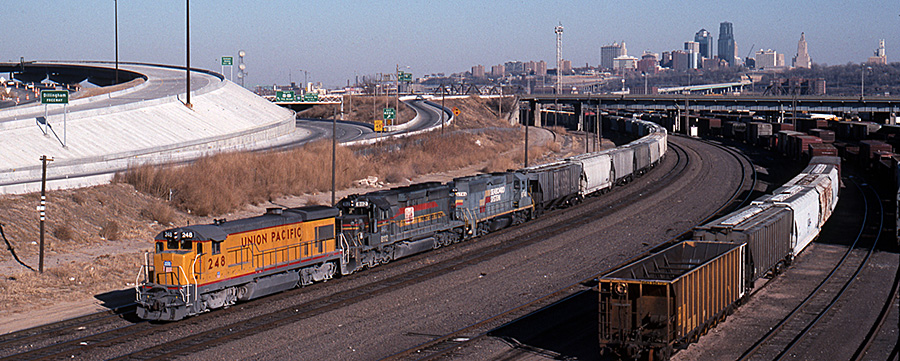 The Kansas City skyline accents this view of a westbound manifest pulled by UP (ex MP) B30-7A 248 and 2 CSXT units, SD40-2 8112 and GP40-2 6746 on Jan. 14, 1990.