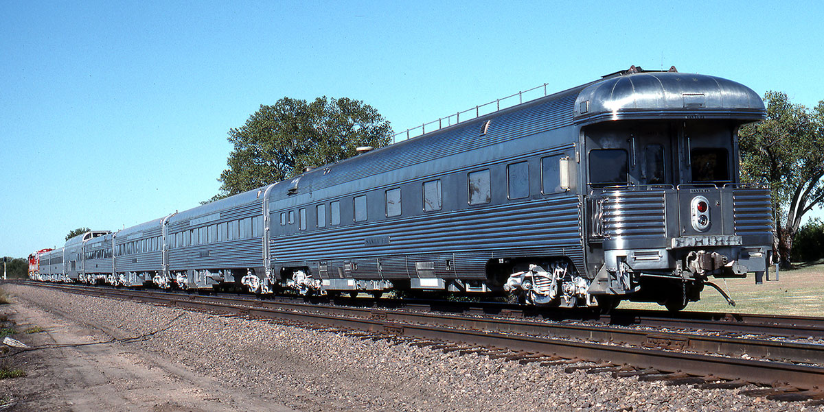 We’re looking at Santa Fe’s handsome Budd-built business car 50, “Santa Fe” as it passes by en route to Solomon, Kansas where the train will be wyed for its return to Kansas City.
