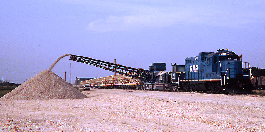 The aggregate cars have a conveyor along the bottom of each car that brings material to another conveyor on the boom. The boom swings out up to 35′ to drop the material where desired.