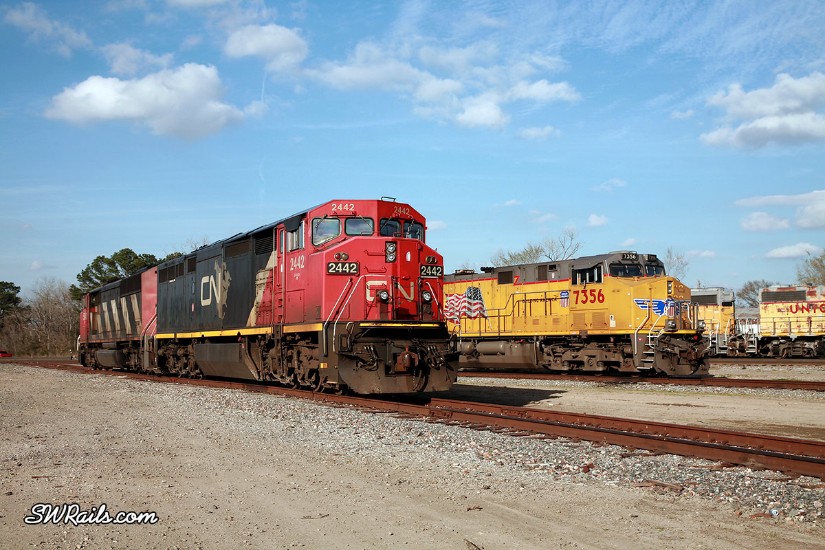 UP and CN power occupy the two new locomotive ready tracks at the far north end of Settegast Yard in Houston. Two GP-38-2's, in dire need of fresh paint, are shoving a cut in the background.