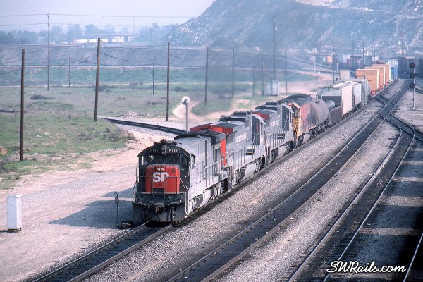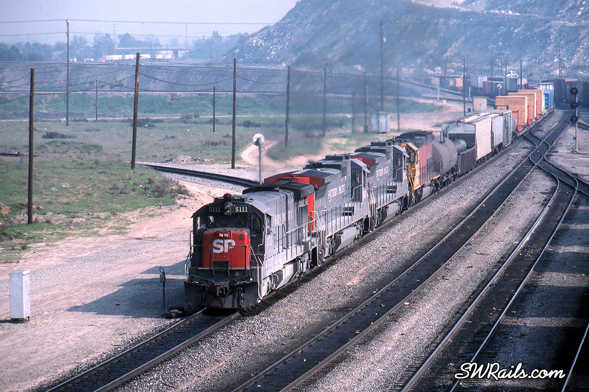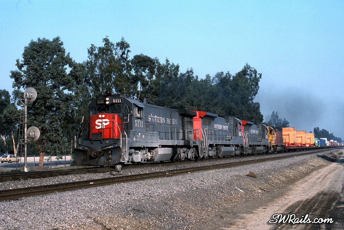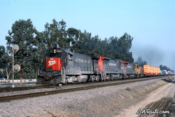 Nevertheless, they could end up anywhere on the system, as evidenced by the 5111 on the point of an NOLXT (New Orleans – Long Beach Trailers) about to pass under the Pepper Ave. overpass at the east end of SP’s West Colton Yard.