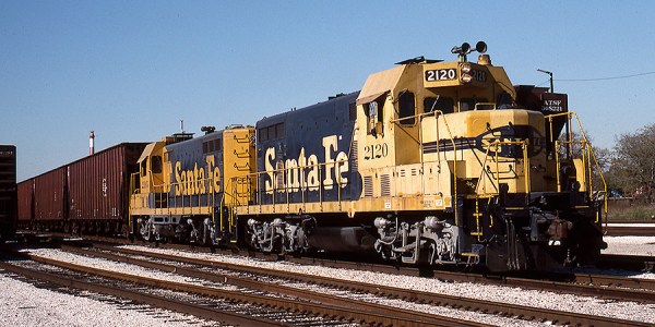 ATSF 2120 and 2195, GP7 graduates of Santa Fe’s Cleburne rebuilding program, are switching a cut of MP wood chip cars. The train is at the PTRA’s (Port Terminal Railway Association) Manchester Yard in southeast Houston.