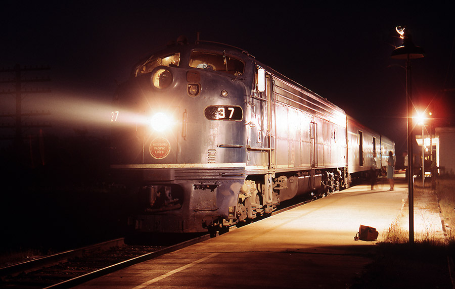 The above view of Missouri Pacific Train #22 illustrates just how few passengers were traveling by train. E8A 37 will have no problem with its two car train – one baggage car and one coach.