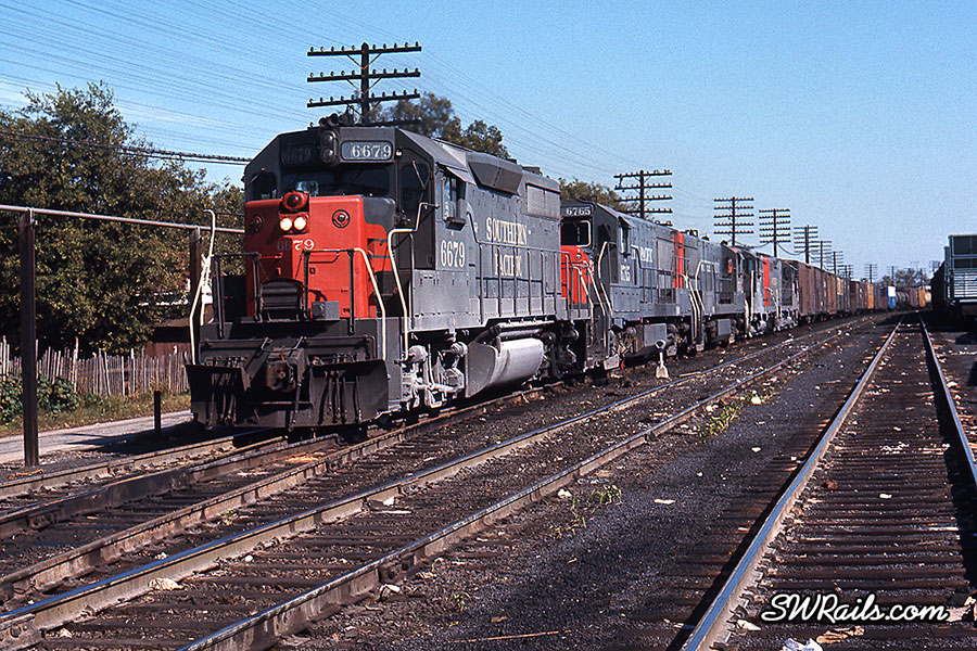 Southern Pacific GP35 6679 is on the point of a WB manifest at East Yard in San Antonio. Trailing are 2 U25B’s and 2 GP9’s, an amazing lash-up for contemporary railfans, but quite run-of-the-mill for November 1968.