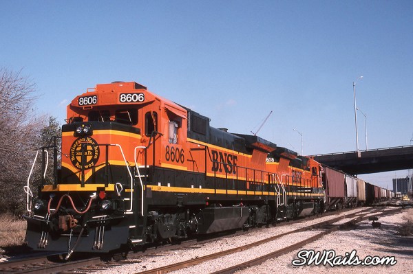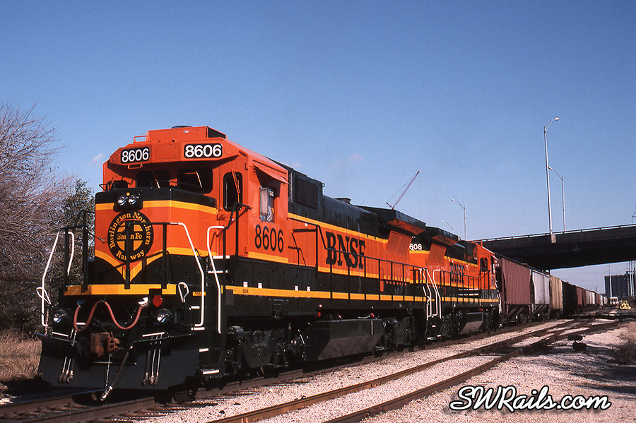 The Santa Fe acquired 40 B40-8’s, 7410 to 7439, in the late 1980’s. They became BNSF 8600-8639. All but 2 of these units received the attractive Heritage 1 scheme during overhauls that occurred between 2000-2001.