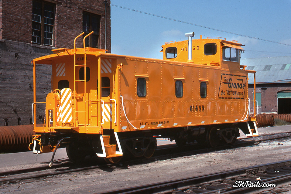 The original pumpkin scheme, Rio Grande orange & black, adorns Rio Grande caboose 01455 at Denver,CO on Sept. 17, 1975. Denver was home to the Burnham shop complex, where the Rio Grande did all heavy maintenance on its rolling stock.