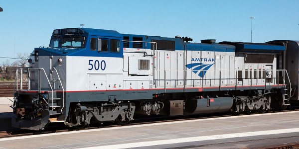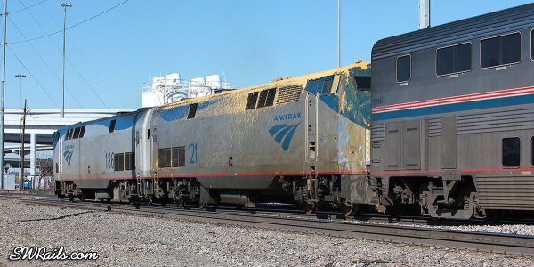One track over was the northbound Texas Eagle. A second unit, P42DC 121 , is being added to the consist. Note the Amtrak employee between the units making the air and electrical connections.