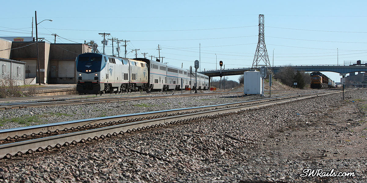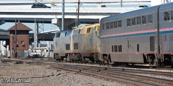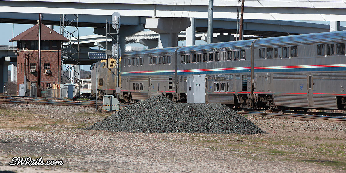 Not wanting to wear out our welcome on this overpass, we headed back towards the Tower 55 area. As we exited the freeway, we saw some Amtrak equipment at the Fort Worth ITC.