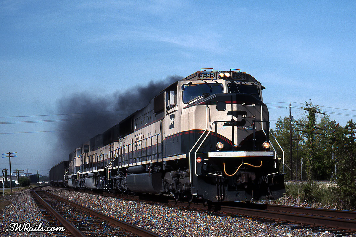 Lead unit BN 9598 was right at two years old in this shot. You wouldn’t expect a two-year old unit to smoke like this, but non-stop trips to and from the Powder River Basin pulling 15,000 ton coal trains will wear out EMD 710 power assemblies like no other service can.