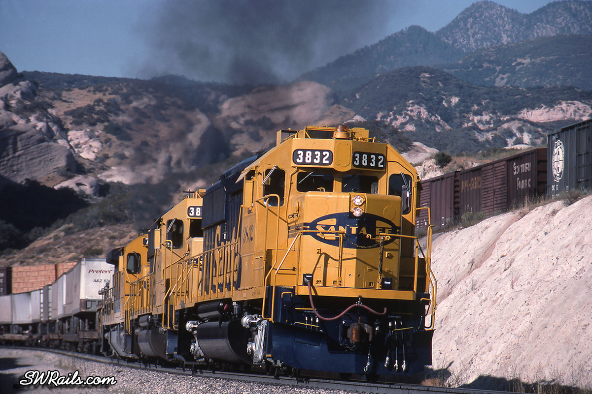 This photo illustrates that drama. The lead engine is at just the right angle to convey a sense of urgent motion while the boiling plume of exhaust illustrates the effort that the locomotives are exerting as they battle the 2.2% grade of Cajon Pass.
