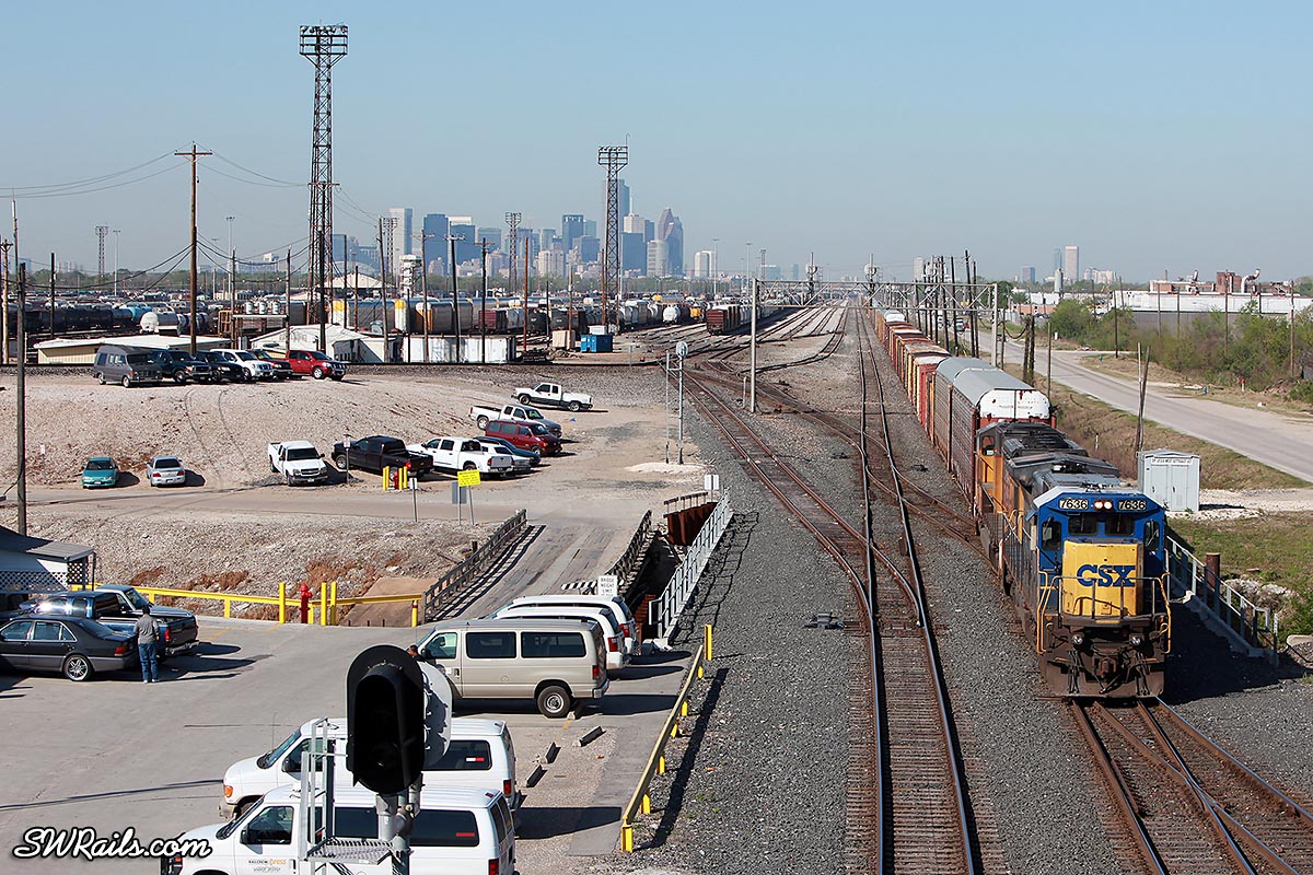 UP symbol ILBNO denotes Intermodal Long Beach, CA – New Orleans, LA. The Englewood bowl yard extends across the majority of the background, with the Houston skyline in the distance.