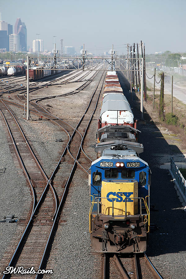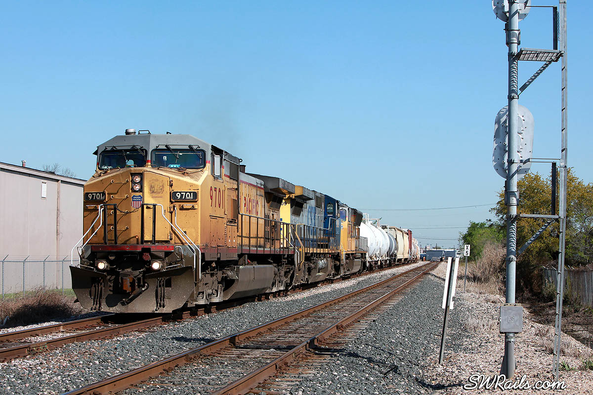 After shooting the ILBNO, I came across a manifest moving south on the West Belt sub. I set up near just north of Cullen for the shot of UP 9701 South, the MHOFP train, (Manifest Houston – Freeport, TX) which is mostly empty tanks for Dow Chemical.