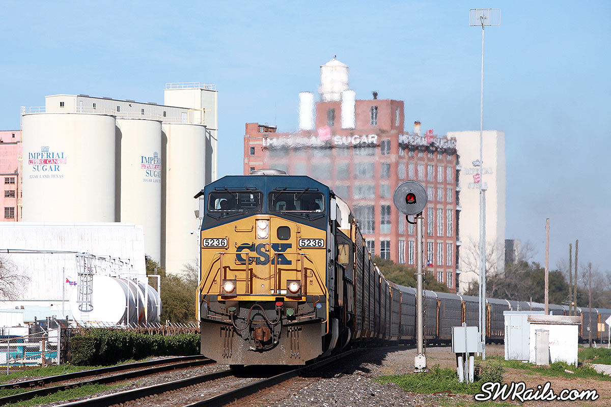 CSXT 5236 leads an empty UP auto rack train westbound at Sugar Land, TX on March 1, 2007