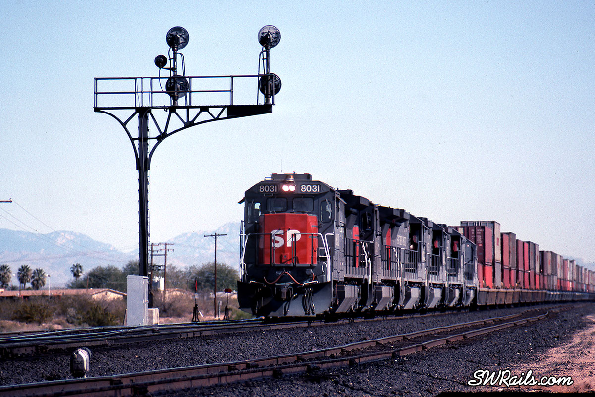 Six 4-axle GE’s are on the point of the AVAXT (Avondale,LA to American President Lines-Long beach, CA) as it passes through Picacho, AZ on March 20, 1988. This train operated 3 times / week in each direction for American President Lines, an early adopter of the land-bridge concept.