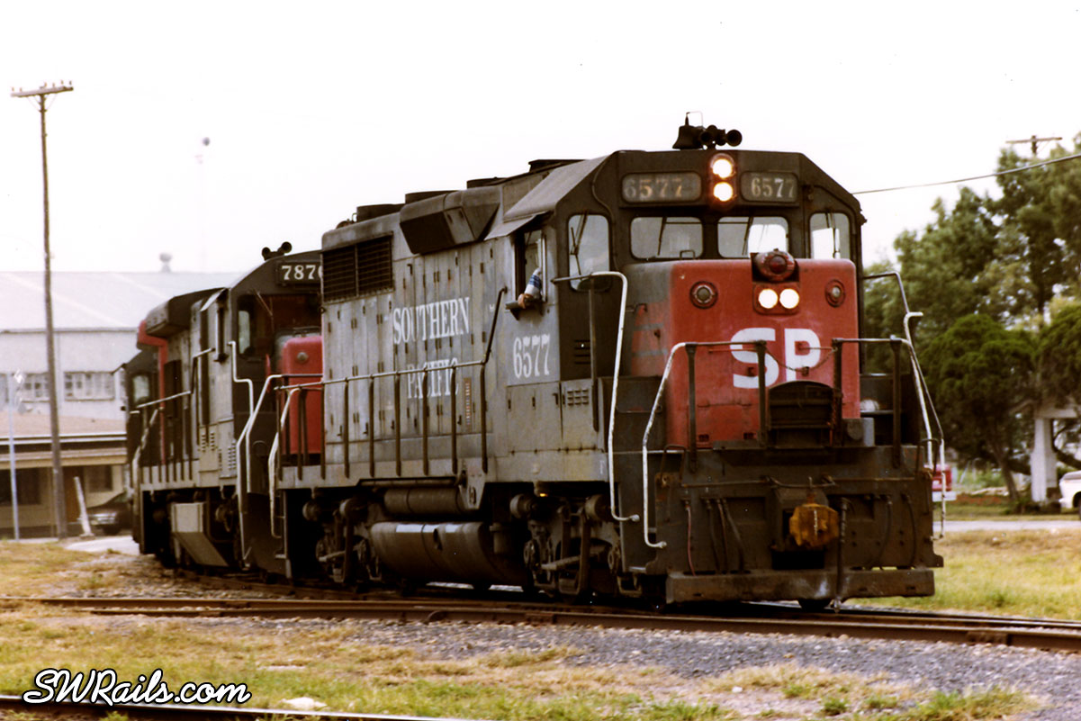 The crew has just parked the HEBVY (Hearne-Brownsville Manifest) in the MP’s Harlingen, TX yard and they are coming onto SP track to tie down their power.