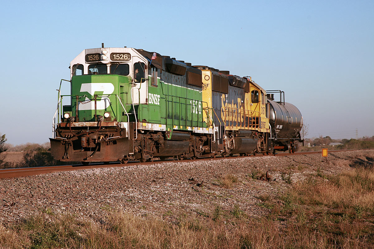 The BNSF Rosenberg local departs Rosenberg, TX on Jan. 9, 2009