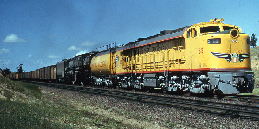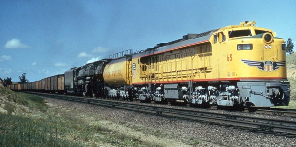 I just watched Pentrex’s “Classic Collectors’ series: Union Pacific” today and they had color footage of this line up going down the road. They had a clip that looked even stranger- a Big Boy being led by a F3 diesel.