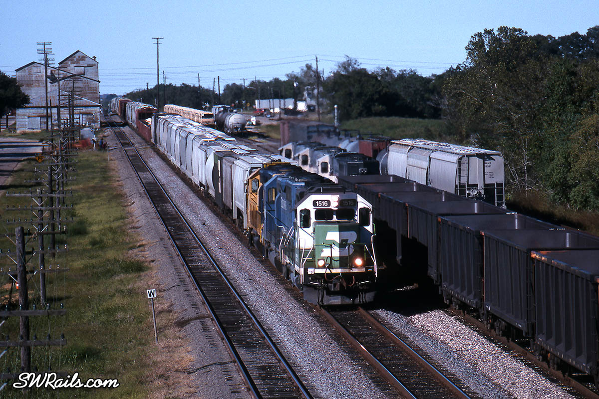 Going back a few years, BN GP28M 1516 leads a southbound manifest while an empty Smithers Lake coal train slow-rolls in the siding on a crystal-clear November 2, 1997.