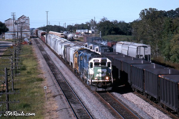I like the image because of the many interesting details. Note the block of flats carrying tan U.S. Army light trucks. They were built at the Stewart & Stevenson plant, just west of Sealy.