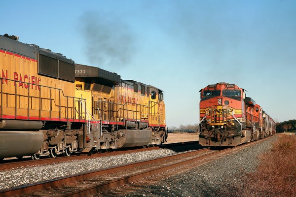 A gravel pile affords me some elevation at MP 20.5 of of UP’s Glidden sub (Stafford,TX) as the empty grain train traverses brand-new track resulting from a slight re-alignment of the UP main. Note the engineer appears to be a real Texan.