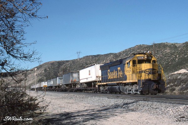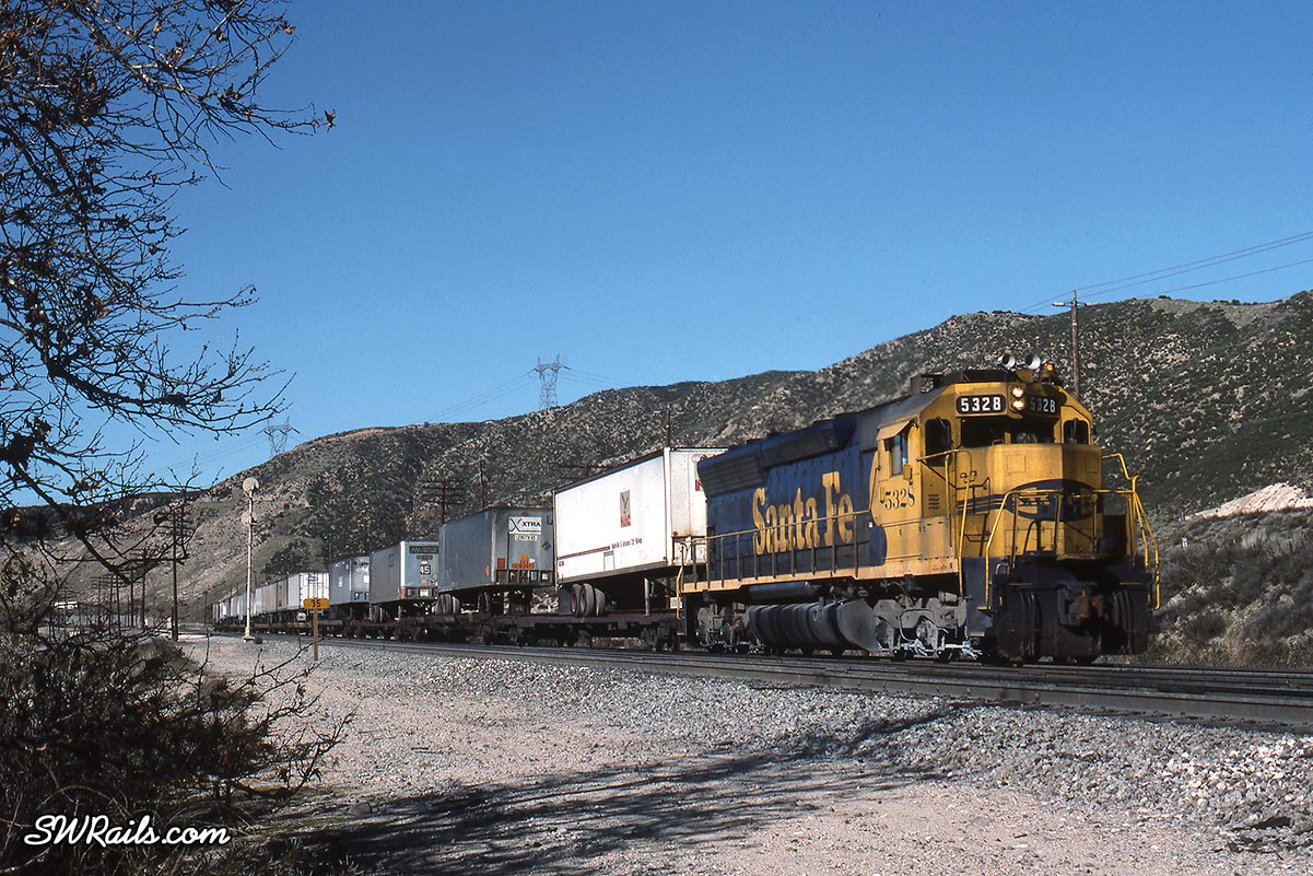 Descending the 2% of Santa Fe's Cajon Pass South Track, SD45 5328 is in full dynamics with the 998 (Richmond, CA - Los Angeles) Sprint train on as it passes the Cajon crossovers on Dec. 12, 1987.