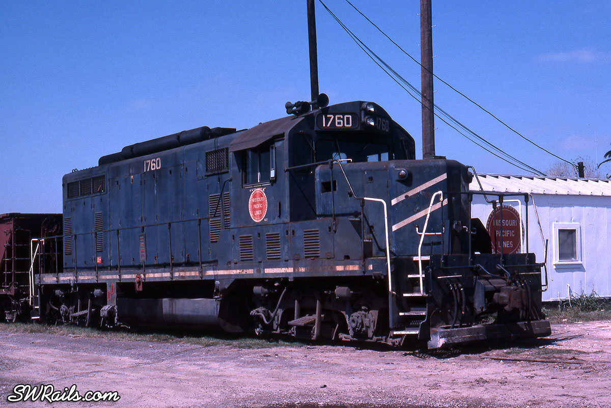 Missouri Pacific GP7 1760 lays over next to the MP's Mission, Texas yard office on Feb. 14, 1980. (Click image to better view the details)