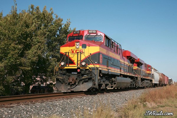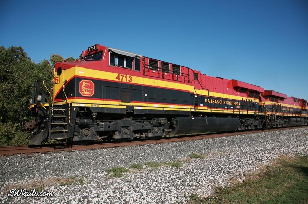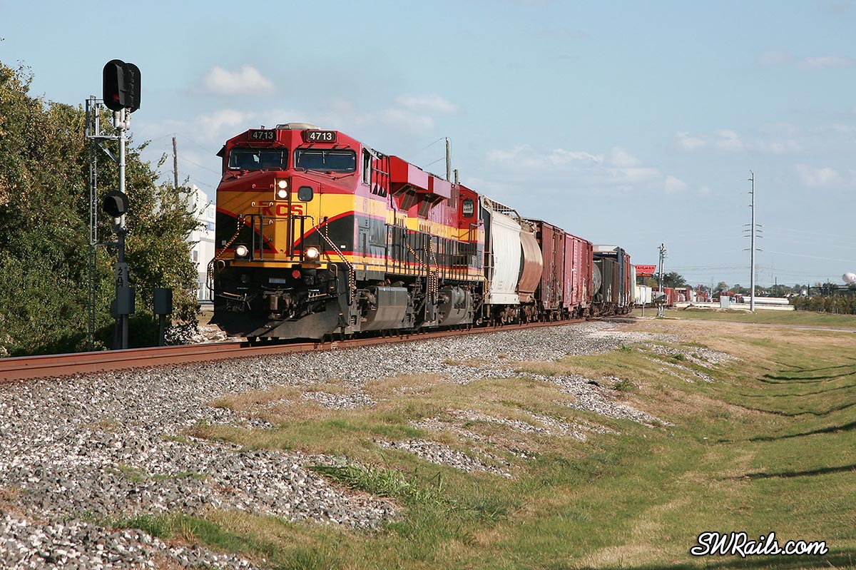 KCSM 4713 leads KCS symbol PALR through Stafford, TX on Oct. 31, 2010