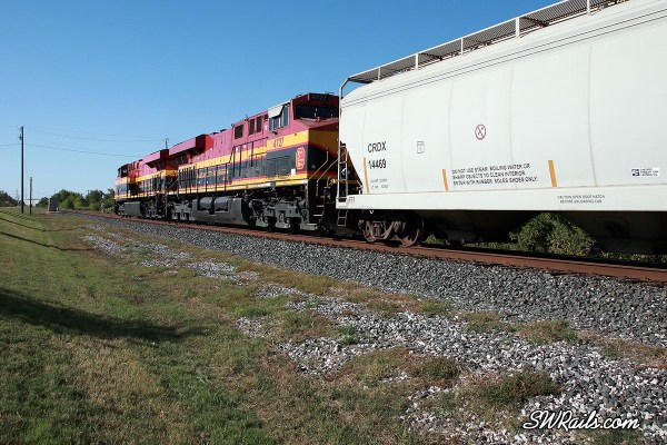 I set up at CP SA019, the west switch of Missouri City for KCS 4684, a loaded 1×1 grain train.