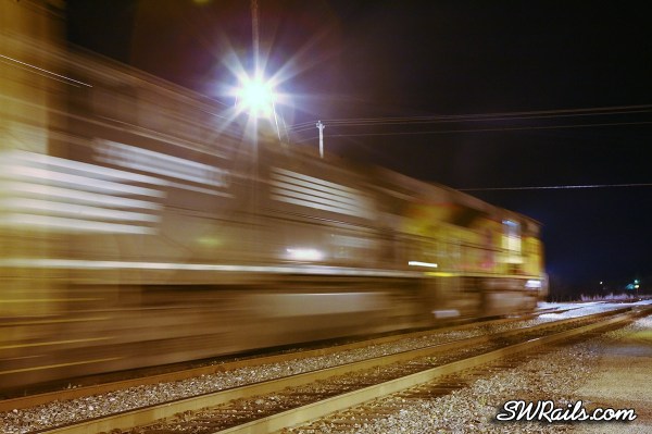 The train is actually doing no more than 5 mph, but a slow shutter speed on my Canon 5D combined with the horizontal lines on the NS engine give the impression that the train is flying.
