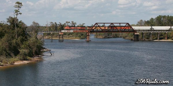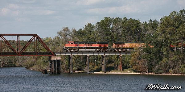 Enough of tunnels through weeds! I set up on the Old Hwy 90 bridge over the San Jacinto River. It wasn’t long before the BNSF 980 glided across the bridge.