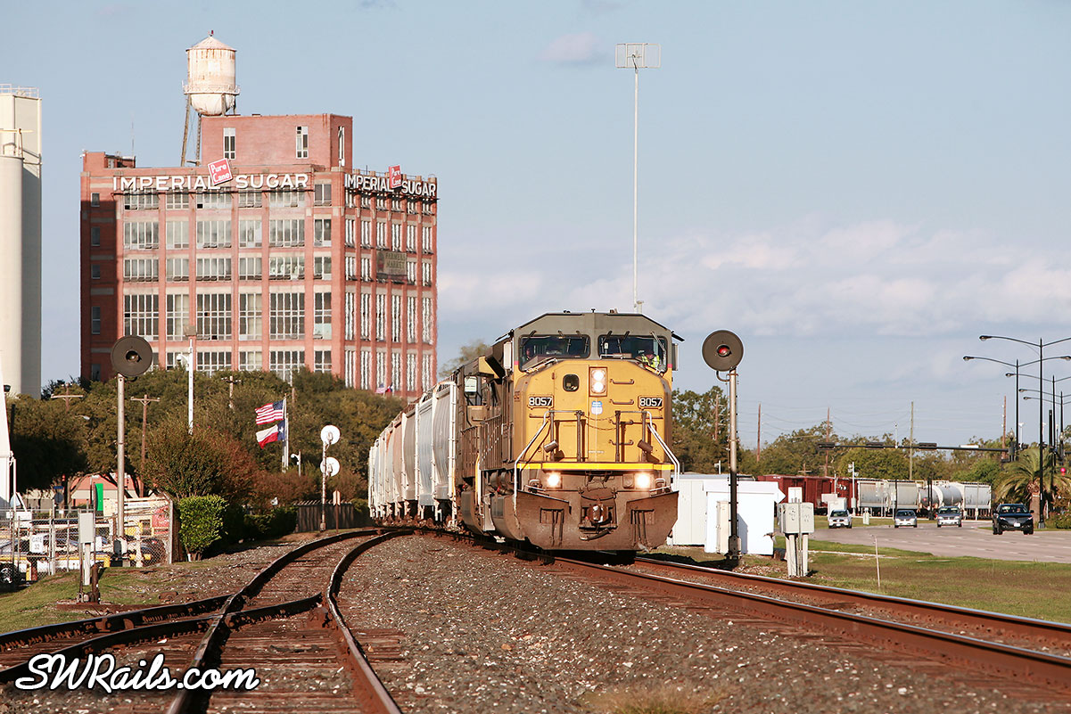 En route home, I took a peek at the signal at CP SA025. It showed another westbound lined up, so I quickly made a u-turn and set up near the east switch of Sugar Land siding. Within 5 minutes, an MEWSA (Englewood to San Antonio) manifest arrived with UP 8057 on the point.