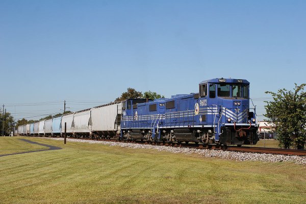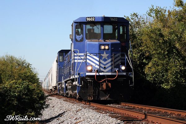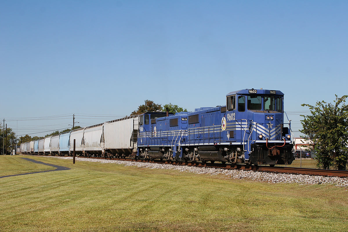 It’s Nov. 22, 2005 and PTRA 9602 and 9616 have just passed Manchester Jct. in southeast Houston with a southbound train of empty covered hoppers.