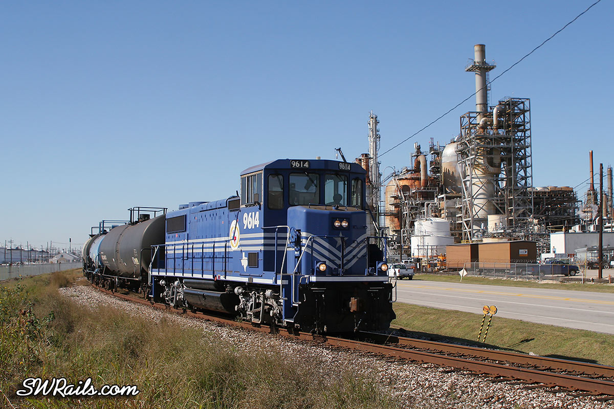 Six days later, we see PTRA 9614 just east (railroad south) of Sinco. The LyondellBasell refinery is in the background.