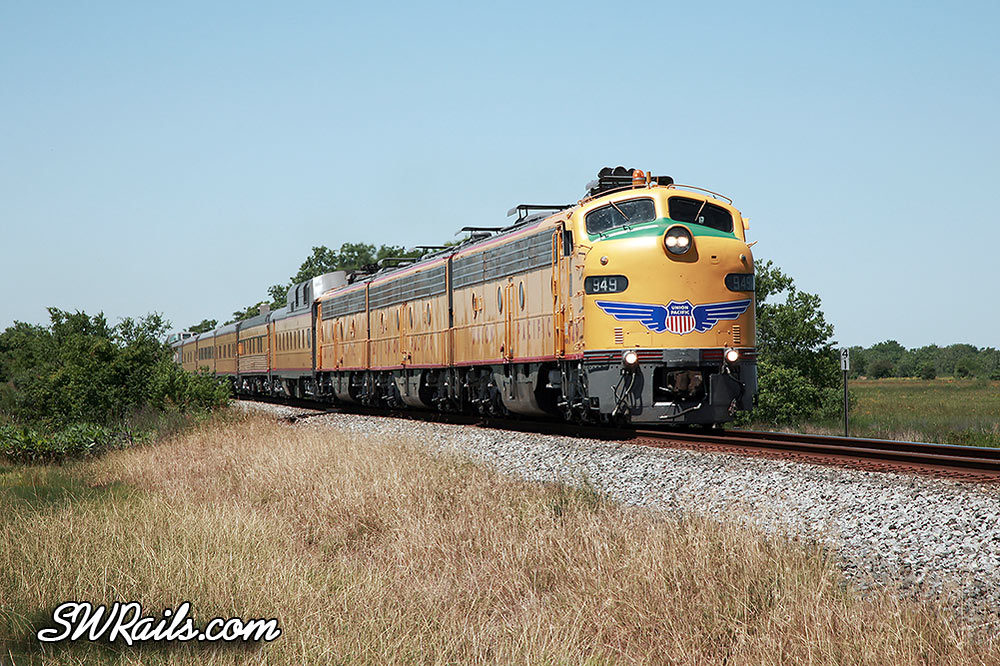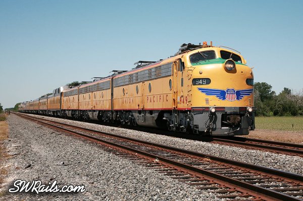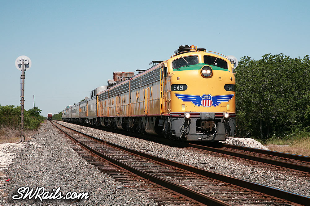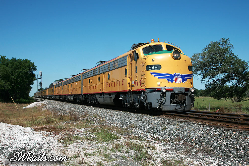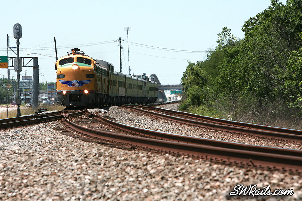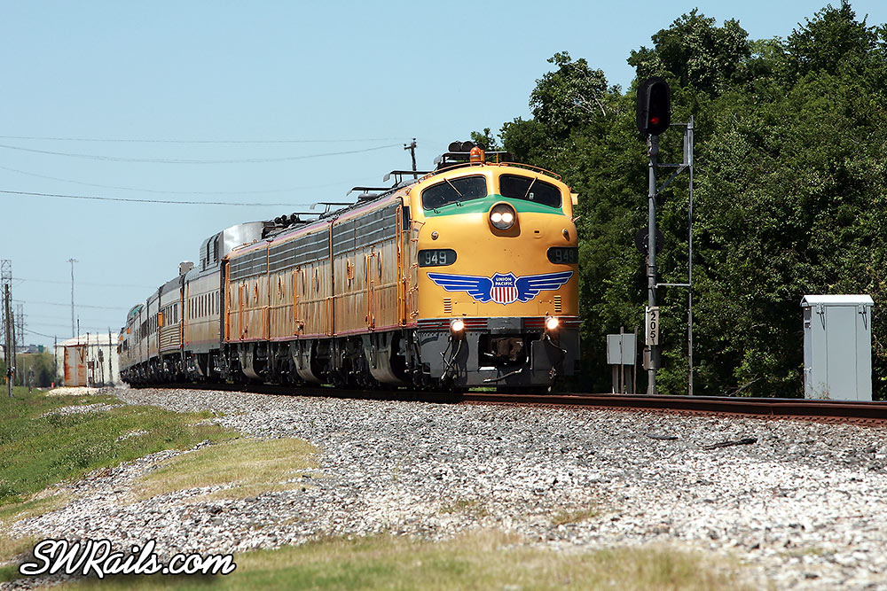 The wheel problems that developed on Union Pacific 844 in Mount Pleasant last week sidelined the legendary locomotive. Fortunately, UP had its E9 trio on a different special train laying over in Hearne, so the UP150 Passenger Special was able to continue its travels with motive power of almost the same vintage. The 844 is 68 years old, the E’s are 57 years old. Who knew?
