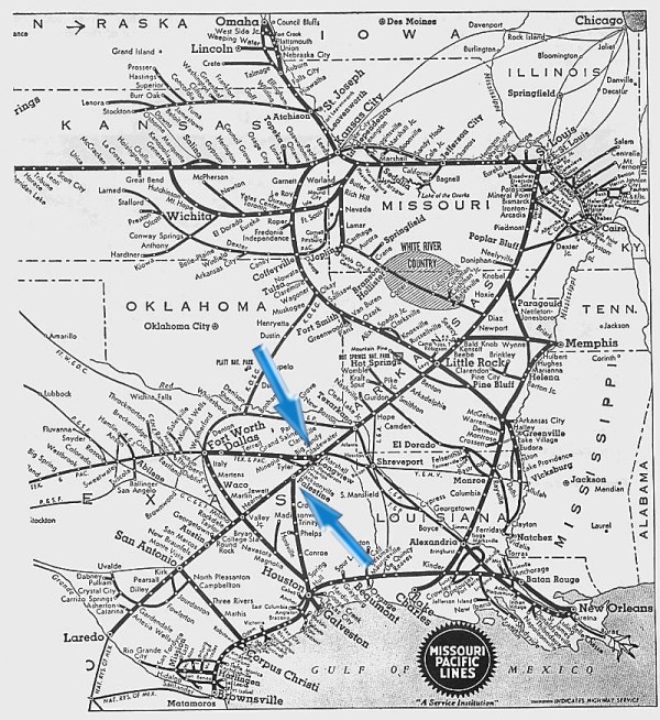 The MP’s route structure made this possible. The St. Louis-Laredo line is a straight shot, with a T&P line diverging westward at Longview and another T&P line diverging southward from Palestine.