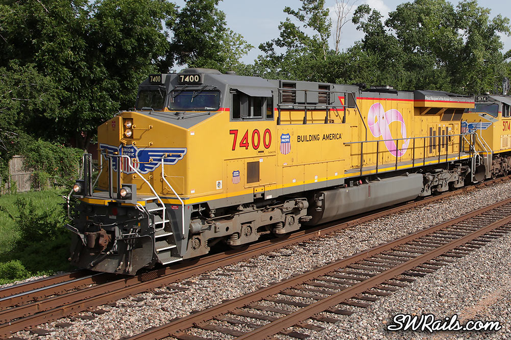 This particular Sunday, July 22, 2012, was special because I knew that UP ES44AC 7400 (Komen Foundation Pink Ribbon unit) was leading the eastbound “juice train” , ZLCAT-20, with an ETA into the Sugar Land area in the afternoon. The plan was to leave the house shortly after the train showed by the scanner at Lissie. Lissie is MP 61, about 35 miles west of Sugar Land. A Z train should take, at most, an hour to cover that distance.