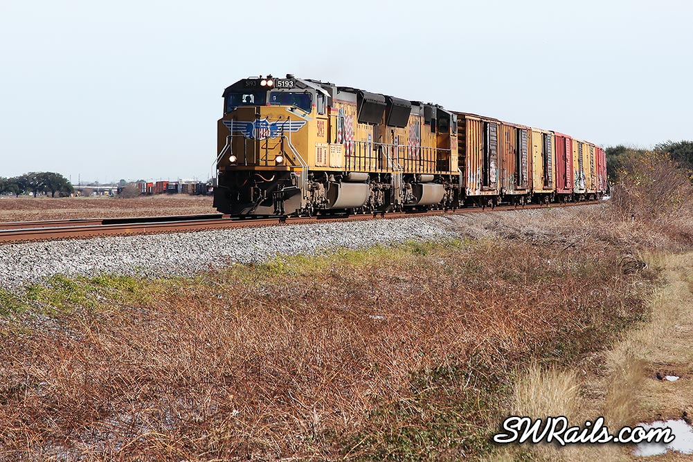 The MEWEG train is a low-priority manifest to Eagle Pass, Texas. The containers in the distant background belong to an eastbound KCS train in the Sugar Land siding that’s waiting for the 5193 to clear the east switch.