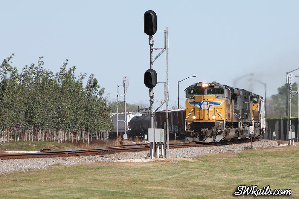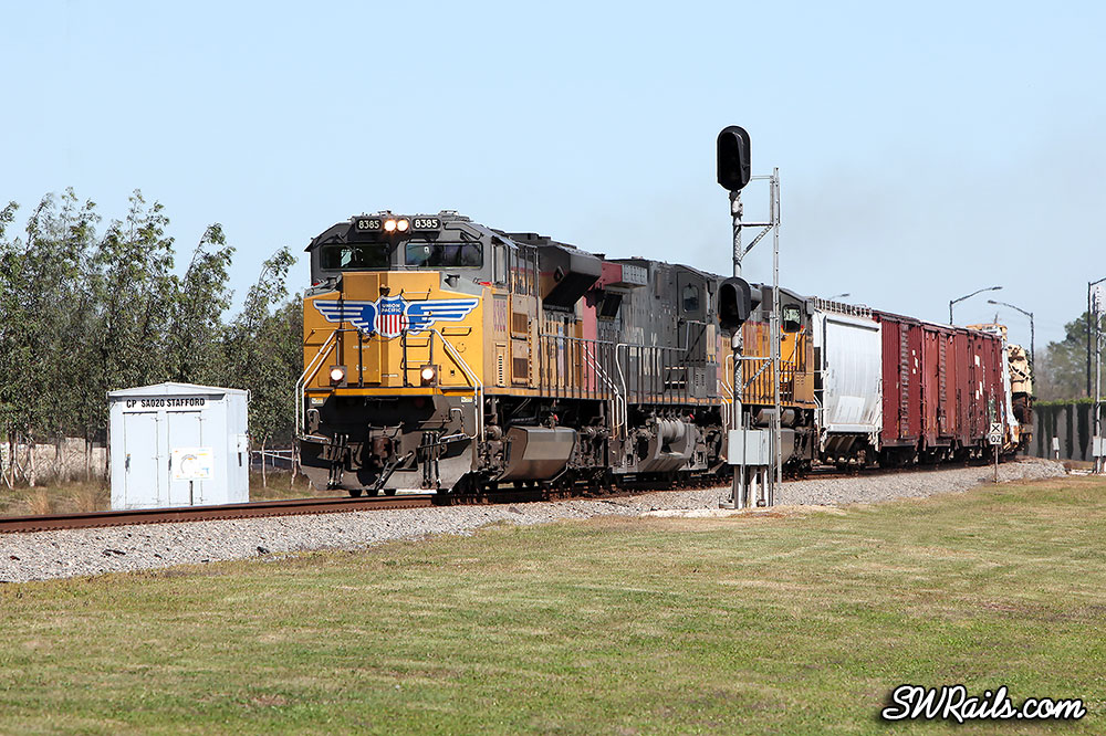 I set up for UP 8385 at CP SA020, in downtown Stafford, Texas. As it came into view in the distance, the second unit seemed somewhat different.
