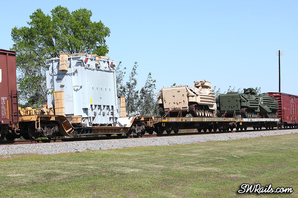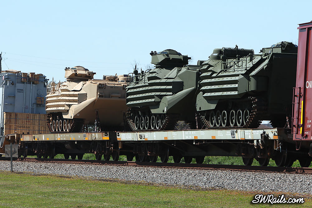 The high-wide load was 5 cars from the head end. Right behind it were 2 DODX flats loaded with USMC AAV-7A1 armored personnel carriers.